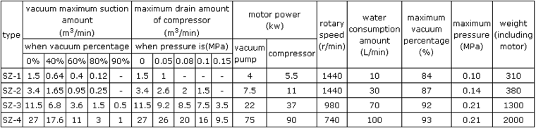 SZ series liquid ring type vacuum pump and compressor is used to suction or compress air and other gas that is non-corrosive, unsolvable in water and with no solid powder, so that vacuum and pressure can be obtained in the sealed container. However, small amount of liquid is allowed in the suctioned gas. The pump is widely used in several sectors such as mechanical, petrochemical, pharmaceutical, food, sugar making and electronic industry.