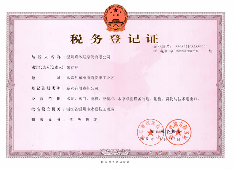 嘉沐斯稅務登記證