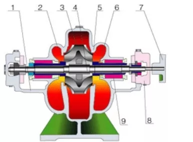 1、 泵體 2、泵蓋 3、葉輪 4、軸 5、雙吸密封環 6、軸套 7、聯軸軸器