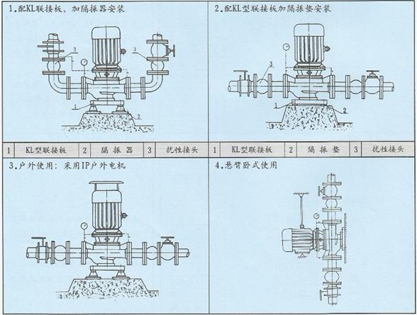 6、ISG離心泵分硬性聯(lián)接安裝和柔懷聯(lián)接安裝兩種(見聯(lián)接方式)。