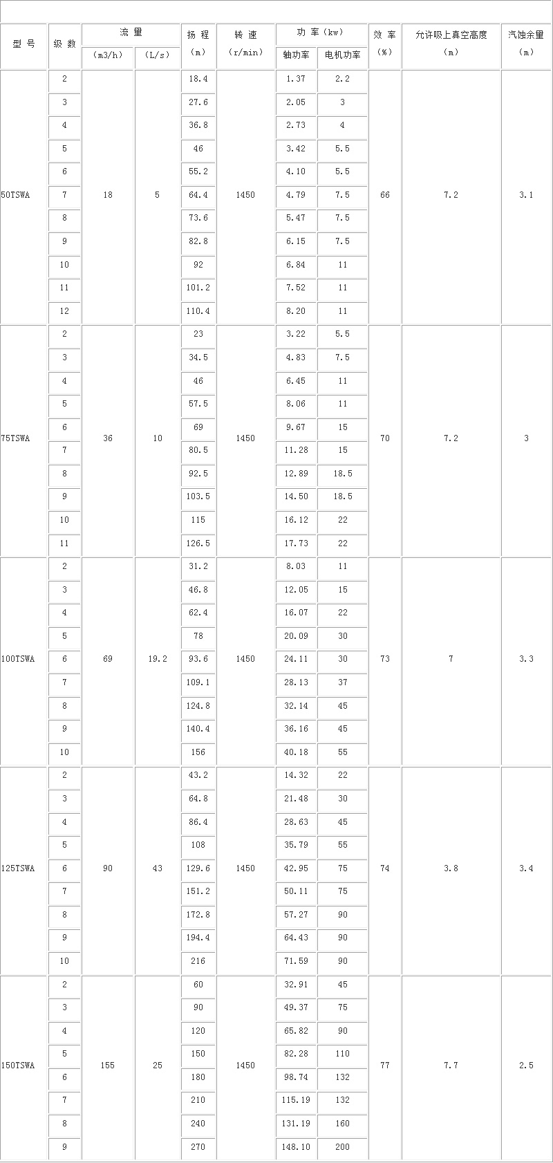 TSWA型多級離心泵系我單位開發生產的節能系列產品,具有運行噪聲低、抗汽蝕性能好、結構合理、使用壽命長等優點。TSWA型臥式多級離心泵全系列共有5個品種40個規格,使用性能范圍:流量Q=15~199m3/h,揚程H=17~247m,轉速n=1450r/min。可供輸送80℃